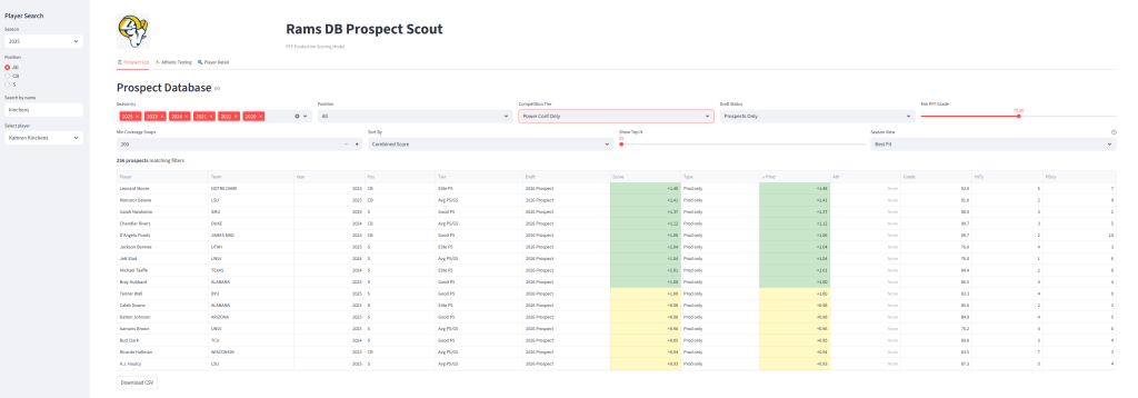 The 2026 Combine hasn’t happened yet, so right now I’m working with production scores only. Once the athletic testing drops, I’ll plug in the numbers and see what shakes out. There’s something satisfying about watching a dashboard populate with fresh data—prospects shuffling up and down the rankings, new names appearing that weren’t on my radar before.