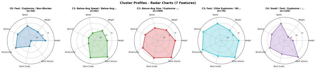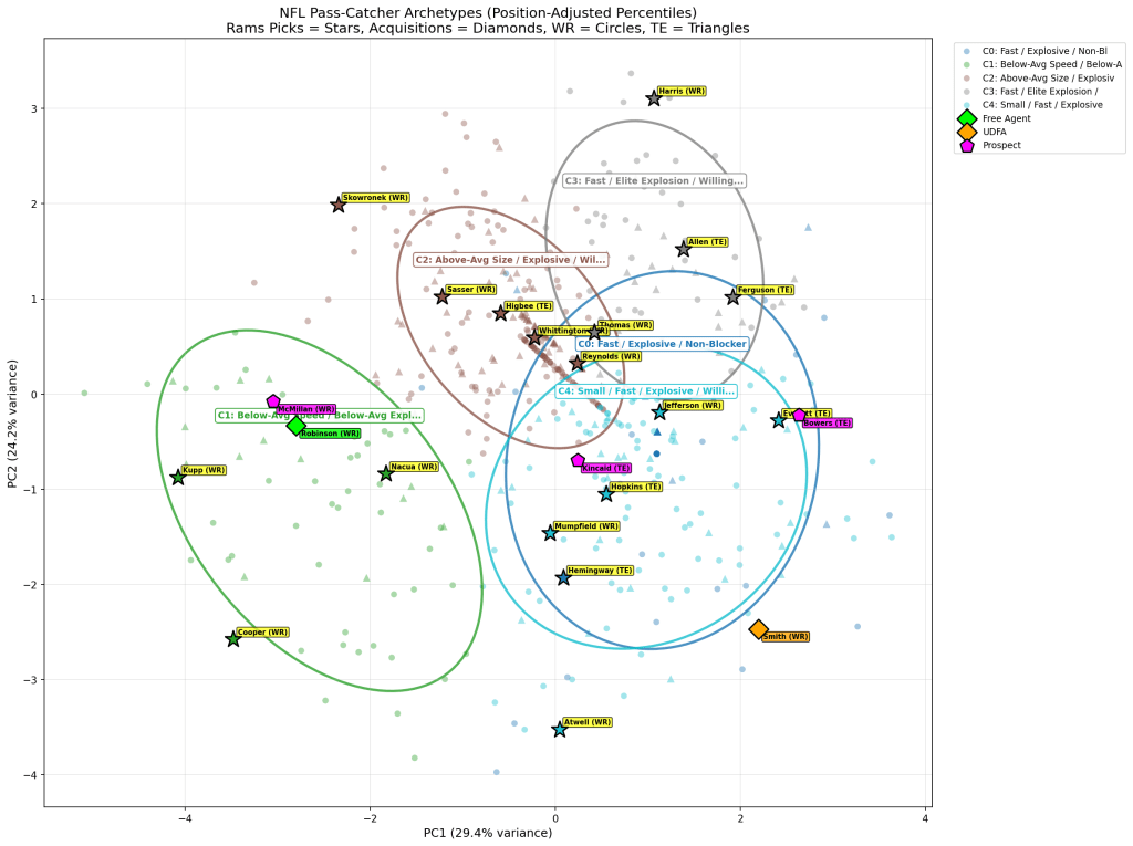For receivers, I used K-means clustering to group players into athletic archetypes. The interesting finding: the Rams’ best picks don’t cluster with the athletic freaks. They cluster with the technicians who block. That tells you something about scheme fit that raw athleticism scores miss entirely. I actually did a 3D cluster chart for the first time ever (see below).