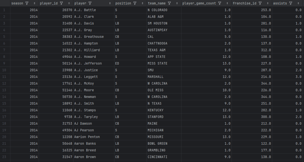 I wrote a Playwright scraper to pull Combine measurements for over 6,000 players—40 times, verticals, broad jumps, the works. This was my first time since my master studies doing web scraping (shout out Professor Fernandes who gave me an excellent grade for that project). I exported PFF college stats going back to 2014, tracking everything from coverage grades to route running scores to yards after catch. I pulled SP+ ratings from CollegeFootballData.com to adjust for strength of schedule, because level of competition really matters at the collegiate level where future professional athletes might be playing against future accountants and computer scientists.